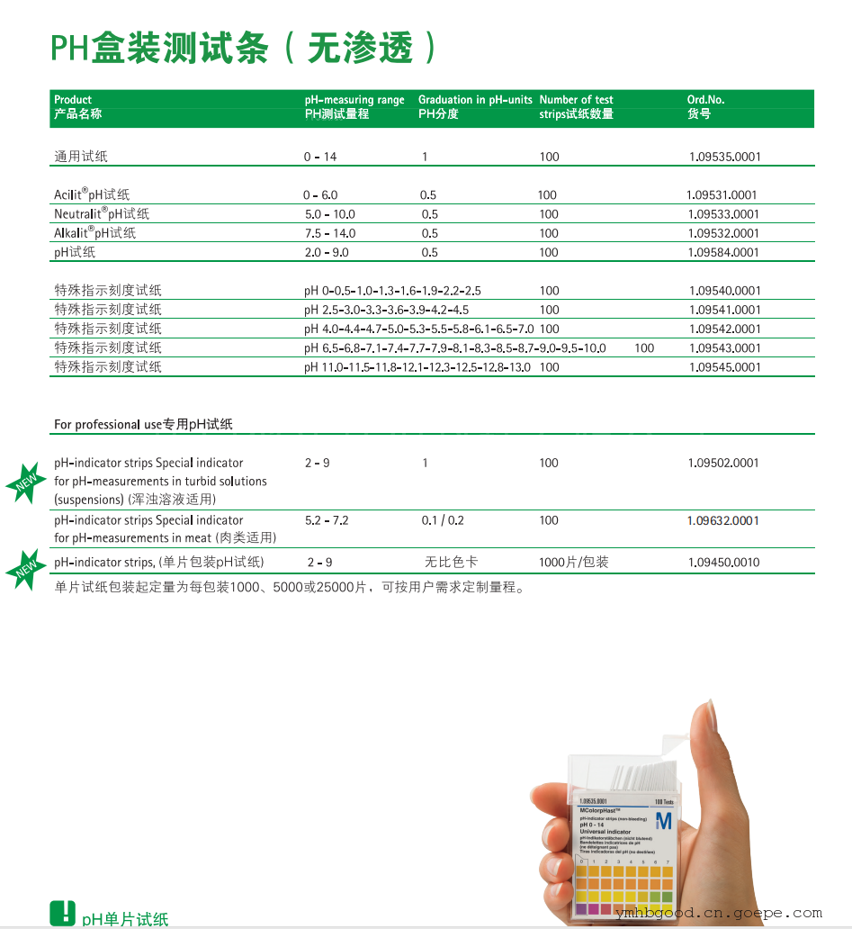 详细信息| 询价留言级别:PH标准试剂 类别:单质 产品规格:100次/盒 品牌:德国默克 型号:1.09533.0001 产品规格:100次/盒 德国默克pH测试条1.09533.0001